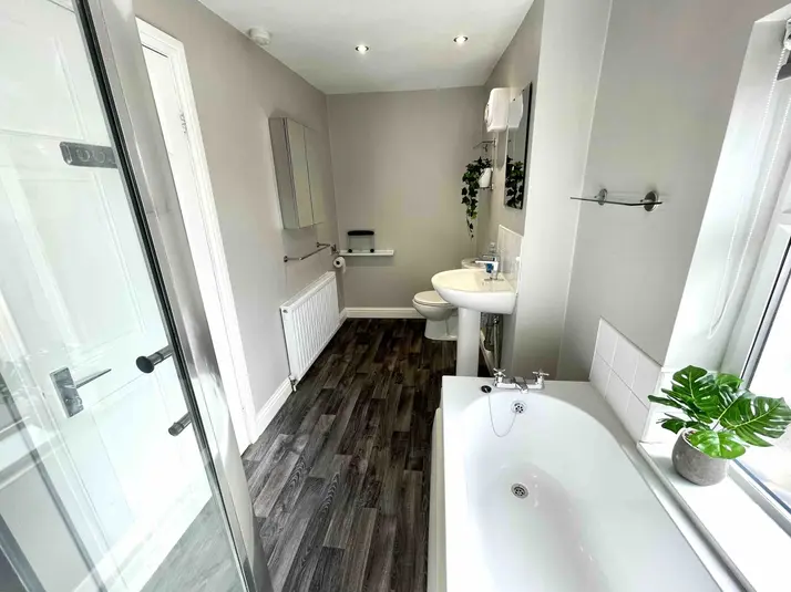 The property benefits from a spacious and modern bathroom, complete with a full-sized bath, separate glass shower enclosure, wash basin and WC. Finished in a clean, contemporary style, it provides both comfort and practicality for shared living.